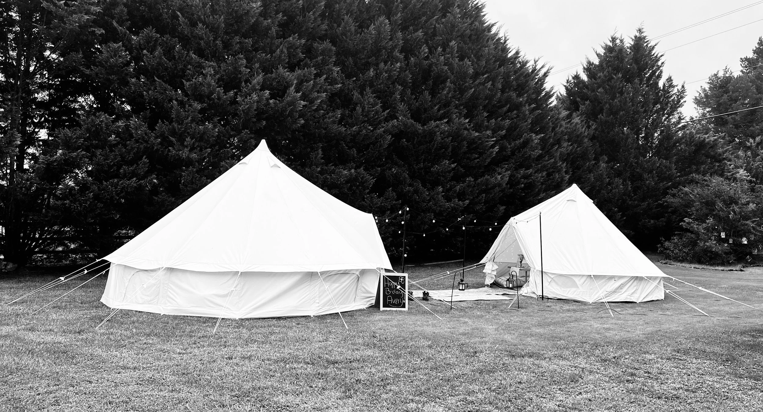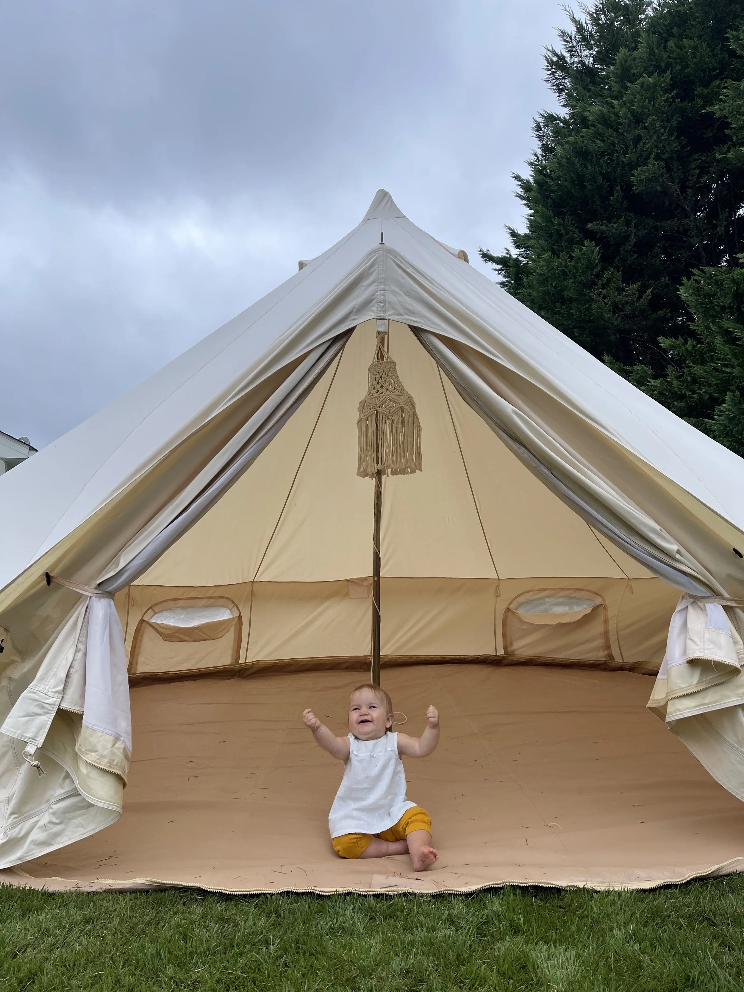 This package includes full-service setup/tear-down for a waterproof canvas bell tent, within 25 miles of Newton, NC. We can travel outside of this service area for a 25$ fee. No decor is included with this package but if you have decor we’re happy to help!