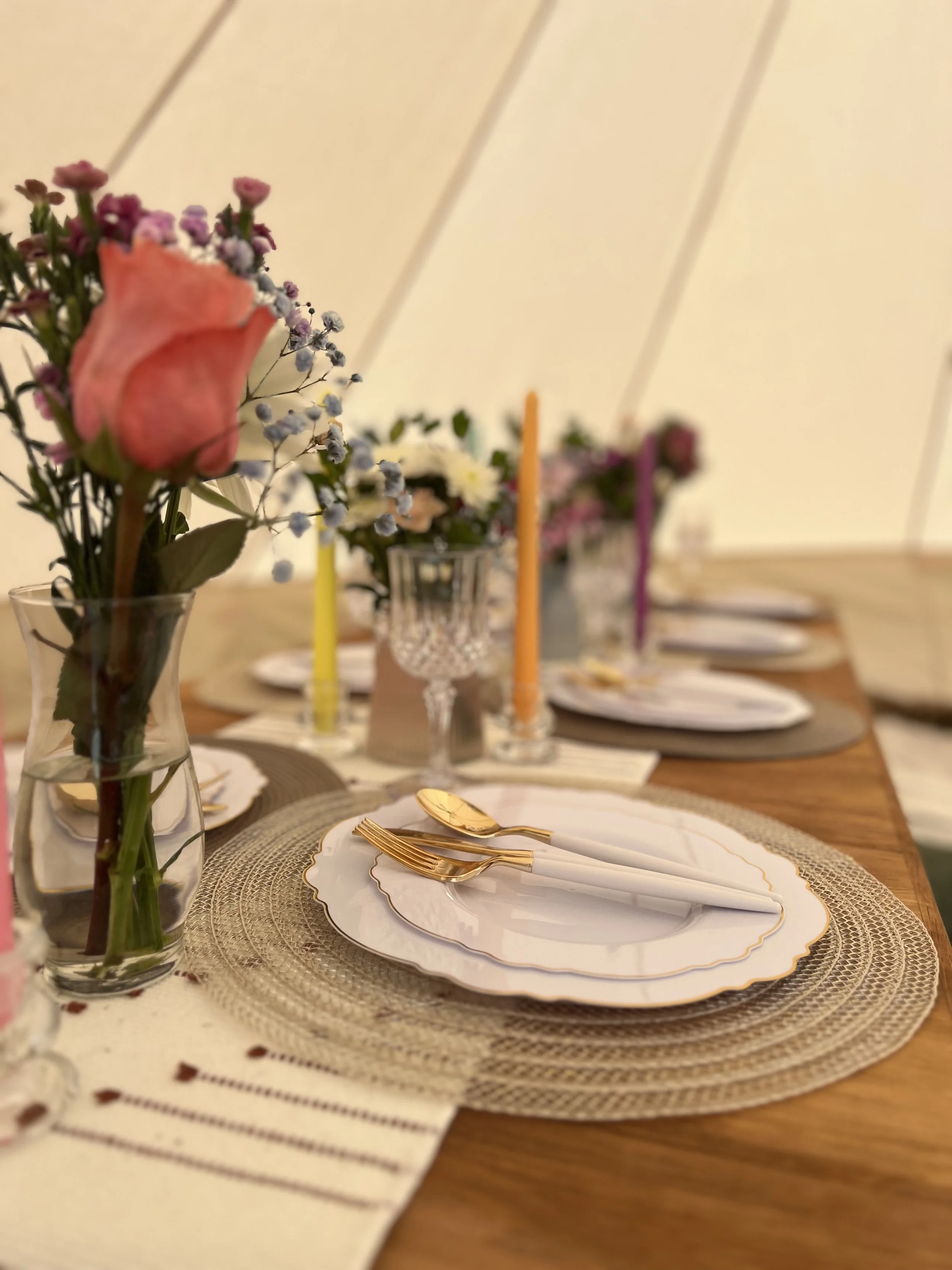This package includes a fully decorated waterproof canvas bell tent, air mattresses, pillows, blankets, rugs, lighting, decor, bedding, side table(s), and fan/heater within 25 miles of Newton, NC. We can travel outside of this service area for a $25 fee.